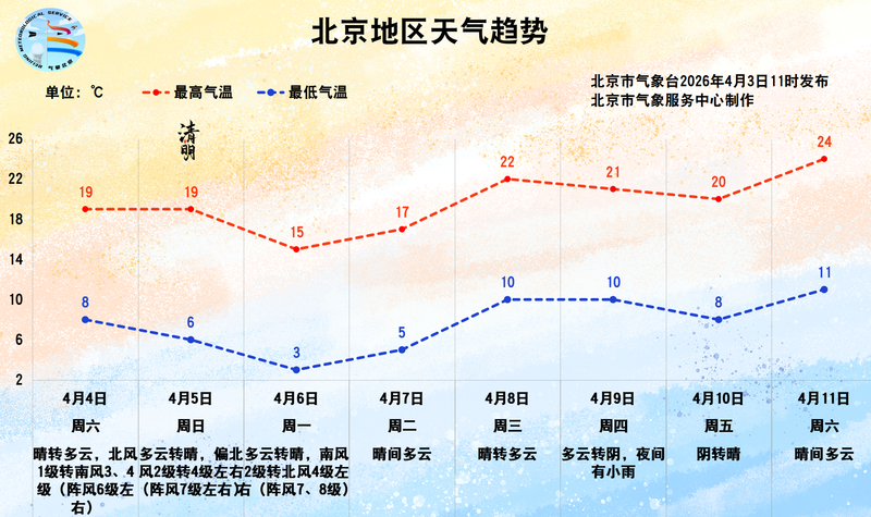 新京报讯(记者 王静熙)今天(4月3日)凌晨以来,北京自西向东出现零星阵雨或雷阵雨,降水总体有小。预计今天中午左右有零星阵雨和雷暴,随后夜间多云。北京今天中午至午夜发布大风黄色预警。中午至夜间风力最强,风力可达8级至9级,并伴有沙尘。外出时要注意防风、防沙。晚高峰出行时要小心。车辆和人员不应停留在高大建筑物、标志、临时建筑或大树下。图片/北京气象台 4月4日至6日为清明节放假。市气象台预计,北京天气以晴到多云多风为主,风力日变化较大,白天阵风6~8级,夜间减弱。最大白天气温15℃至19℃,夜间最低气温3℃至8℃。 4月7日至11日,北京天气晴转多云,气温持续上升。白天最高气温为 17°C 至 24°C,夜间最低气温为 5°C 至 11°C。据日本气象厅称,最近风很大,户外活动时要小心。由于气候干燥,用火、用电时要小心。清明节将至,请文明礼貌、清洁卫生、谨防火灾。编辑:刘梦洁、校对:王欣
