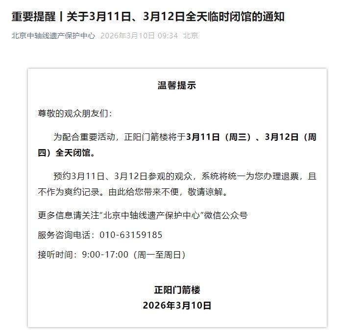 作者:bet356官网首页2026年3月11日2026年3月11日对“正阳门箭楼3月11日至12日全天闭馆 – 新京报”作出评论 新京报讯 据北京中轴线遗产保护中心介绍,正阳门射箭楼将于3月11日(周三)、3月12日(周四)全天闭馆,以配合重要活动。对于3月11日至12日预订行程的游客,系统将处理退款,不会被记录为缺席。对于给您带来的不便,我们深表歉意。陈艳婷编辑