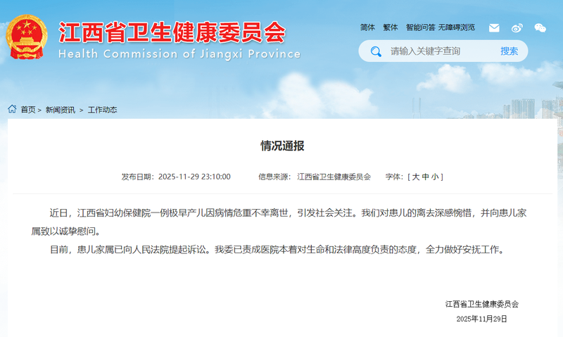 新京报11月29日晚间,江西省卫健委发布情况通报:近日,江西省妇幼保健院收治的一名极早产儿不幸死亡,病情严重,引发社交焦虑。我们对您儿子的去世深感悲痛,并向死者家属表示最深切的哀悼。目前,男孩的家人正在向人民法院提起诉讼。我们委员会已指示医院以对生活和法律非常负责任的态度尽一切可能提供安慰。编辑 毛天宇